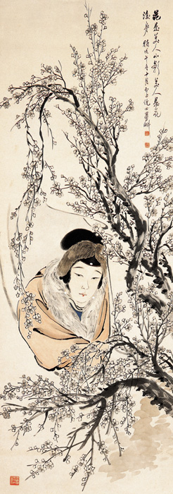 人物画家在画人物时,有时为了避免单调,往往将人物置于一种精心构置的氛围和环境中。此《梅花仕女图》就是将一妩媚清丽女子的倩影安置在高洁清雅的梅影中,二者相得益彰,互为衬托,更能表达画面意境。