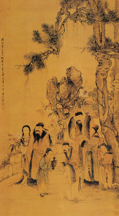 图中耸立两株青松,虬枝盘折,古藤披垂,气势非凡。松下湖石峻峭,芍药盛开。此图似是取意韩魏公邀客品赏芍药名品—金带之轶事。据说“此花开者,城中必出宰相”,后果如此言,品赏此花的人,后皆入相。此画用笔工整,以钱线描写衣纹,人物神态各异,均有生意。色彩古雅,韵味高远。