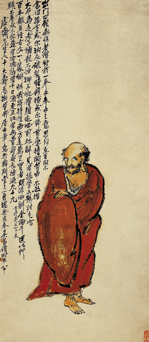 吴昌硕 纸本设色 吴昌硕(1844—1927),中国清末民初画家、书法家、篆刻家。名俊卿,初字香补,中年后更字昌硕,亦署仓硕、苍石,别号缶庐、老苍、苦铁、大聋、石尊者、破菏亭长等。出生于浙江一个读书人家庭,自幼随父读书,后就学于私塾。十余岁喜刻印章,其父加以指点,初入门径。后到苏州、上海,与任颐、张熊等交从甚密,期间幸而得见很多艺术真迹,遂而对绘画产生浓厚兴趣,艺术修养也得到了很大的提高。吴昌硕绘画题材以花卉为主,很少涉及人物。但其人物画却有很高的水平,如《老僧》。画中老僧精神矍铄而形容清澹,用笔很是老到。 |