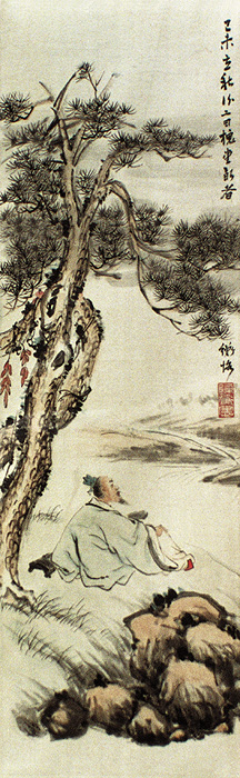 陈师曾,名衡恪,字师曾,号槐堂,又号朽道人,义宁人。与齐白石交往甚深,人物、山水、花卉俱见功力,尤长写意,师事吴昌硕,出入陈淳、徐渭、赵之谦诸家,而又具有自家面目。《槐堂韵者图》以粗率笔触绘松树,松下的老者瘦骨清癯,似乎陷入一种沉思。以细劲流畅的线条描绘,远处的山峰用淡墨悄然带过,文石则用浓墨点苔,细笔绘丛草,整个画面笼罩在一种清幽冷寂的环境中,老者因而显得更加从容而睿智。