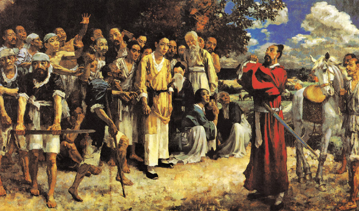 这是徐悲鸿的油画代表作之一,是场面宏大、人物众多的大构图创作。作品取材于《史记·田儋列传》,说的是战国时代齐国的旧王族田横在秦末农民起义中率众五百人入居海岛,刘邦建汉后派人招降,田横告别众人赴洛阳,途中拔剑自刎,五百壮士闻之也全部自杀殉节。画面描写田横与五百壮士告别时的情景,身着暗红紫袍的田横昂头拱手、正气凛然,众壮士或摩拳擦掌或低头饮泣,气氛悲壮。当时画家虽然不可能对这一行动作出正确的历史评价,但借此历史事故表达出针对当时的反动统治和社会黑暗的愤恨以及对威武不屈的反抗精神的歌颂。很有意思的是,徐悲鸿把众壮士中那个身着黄衣者画成了自己的形象,这也是画家不畏强暴的正义感的一种形象表达。 |