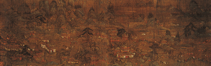 此图描绘一大型皇家园林景致。图中山峦起伏,林木葱郁,河道萦回,其中气宇轩昂的楼、阁、亭、台、廊、桥星罗棋布,有的建造于山中或河岸平地。气派宏大雄伟,富丽堂皇。画中游人悠闲风雅又热闹欢快,虽然熙熙攘攘,却如人间仙境。体现了唐代宫廷及贵族阶层悠闲而奢华的生活。同时也体现了唐代的繁荣富庶以及园林建筑的极高水平。画中笔法谨细,尤其建筑物及人马的描绘更是精细周到。敷色艳丽多彩,在整体的冷色中,朱砂、粉色等更为鲜艳夺目,加上勒金的光彩,使画中之景更显出金碧辉煌的富贵气象。