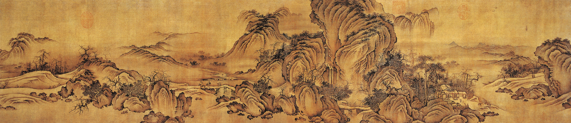 本图开卷处图绘远山溪岸,继而群峰叠起大壑飞瀑,颇为壮观,再次又转入平川冈阜秋树远山,渐成清远之境,布局变化错落有致。全卷以水墨为主,间以简淡之赋色,山石皴纹稍嫌呆板,林木结构系出于郭熙传派,与传世燕文贵作品之风格有出入,似应为南宋画家的手笔。卷上有燕文贵小字款,乃后人所加。画上钤有“琴书堂”、“信公欣赏”及乾隆收藏多方印章。