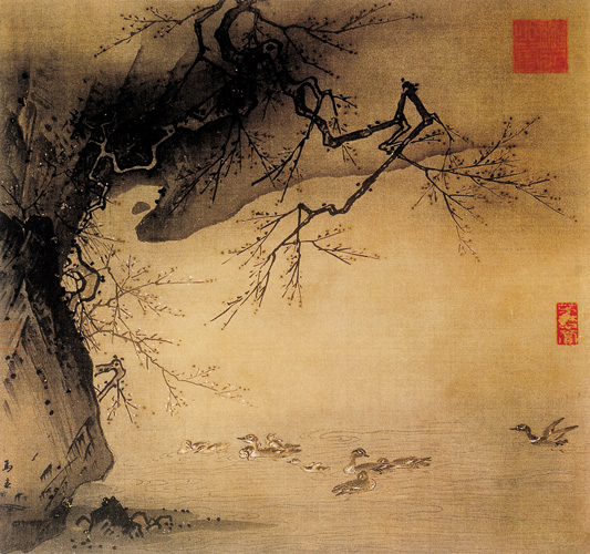 此画绘梅枝斜出石上,水中有群凫飞集浮泳。剪裁、构图新巧。有款“马远”二小字。所绘梅枝刚劲曲折,又有力度,用焦墨勾勒的树干,显得“瘦硬如屈铁”。山石用大斧劈皴,坚实,爽朗而有力。水波绘制生动,表现迂迥、盘旋、以及由微风吹起的微波,画得十分动人。马远的山水画变古来诸家全景之法,新奇布局,因此有“或峭峰其上,而不见顶;或绝壁直下,而不写脚,或近山参天,远山则低;或孤舟泛月,一人独坐”的说法。