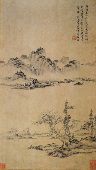 《潮满春江图》是画家的传世作品,其中部空白,以虚带实,意为茫茫江水,下部坡坨断续,野树参差。小舟停靠。得江南江汊野趣。上部群峦叠嶂,云岚缥缈。山头用重墨点拈以外,远山近山均施淡墨,意境清旷。自题七绝一首:“潮满春江澹不流,东风扇暖柳初柔,夕阳遥见青山色,吹破浮云落小舟。”