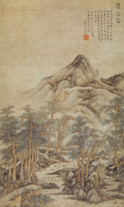 文伯仁(1502—1575),字德承,号五峰山人,又号葆生,摄山老农,长州(今江苏苏州)人。文徵明侄子。山水、人物师王叔明,笔力清劲,岩峦郁茂。《樵谷图》描绘的是意境清幽的山水景色。画面上古松葱郁,枝干遒劲,生意昂然。溪水蜿蜒从山中而出,似闻淙淙水声。溪边有一院落茅舍,后山头草木回春,烟气苍茫。整幅作品富有山村生活气息。墨笔细润、松秀,构图自然,毫无矫造而得野趣。