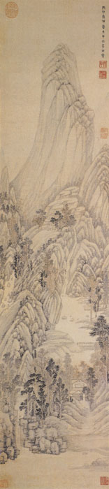 吴彬,明末画家,生卒不详,字文中,号枝庵发僧、枝隐庵主,蒲田(今属福建)人,流寓金陵,山水亦佳,工丽整秀,颇得神宗称赏。画面上部为一挺秀独立的主峰高高耸起,其下有侧峰支岭,层层叠起,碎石浅滩,出没山前。山间遍生丛树,细瀑清泉从山上跌宕而下,在山下汇为平静的河流。画中笔法温厚而松秀,山石树木造型整肃,秩序井然,程式严密,但稍有板滞之弊。其设色温雅清淡,更使画面境界奇秀,温和而雅致。