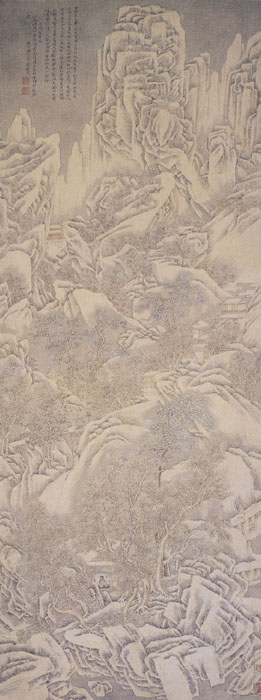 萧云从(1596—1673)明末清初的画家。字尺木,号默思、无闷道人、于湖渔人等。明朝灭亡后始称钟山老人,寓意仰望钟山陵阕(明陵)。他自幼习诗文书画,明崇祯年间曾参加反对宦官魏忠贤的复社。入清后,他拒绝作官,遍游名山大川,或闭门读书,寄情诗文书画。画面的山石用笔勾画,无皴染,以突出雪景,富有版画的韵味。