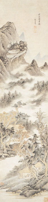 沈士充的山水以清劲细静见长,这幅画中的几株枯木用笔简括,人物衣纹用笔简约劲挺,流畅无碍。堤岸山峦以浓淡不同的线条勾形,再施以淡墨晕染,勾勒笔力尖劲,显示了画家的功力,晕染墨色轻淡湿润,石壁用斧披皴法,山坡上少林木点苔。水面用大片的空白表现。画面的气氛非常清淡枯寂,显示了画家清静超逸的心怀。