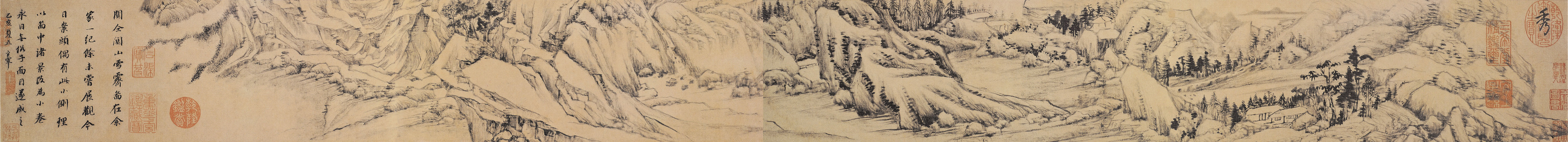 此画用墨笔画平远山景。山峦起伏层叠,林壑幽深,连绵无际。全幅布局严紧而气势雄健,苍苍莽莽,一气呵成。用笔苍劲老辣,墨气浑厚,兼有生拙秀润的特点。画中自题云:“关仝关山雪霁图在余家,一纪余未尝展观。今日案头偶有此小侧理,以图中诸景改为小卷,永日无俗子面目,遂成之。乙亥夏五,玄宰。”正如卷后顾大申跋谓“文敏墨妙,自成一家,适意匠心,不全摹古”者。
