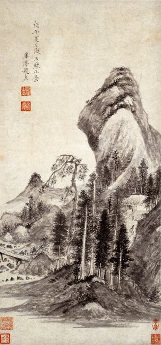 这幅作品描绘的是傍山村野的景致。近处坡岸林木,苍润葱郁,远接高峰叠岫;山谷间有草屋坪地,有人物活动其间。左岸板桥临溪,画景虽少而意境开阔。以阔笔作皴,墨韵浓润厚重。画家自识:“戊午夏日,仿巨然小景,华亭赵左”。这幅作品山石、树木画法虽可窥见巨然的影子,但有着画家自己的风格,较之巨然,画家用笔愈显舒放,皴染结合,滋润厚重。整幅作品风格清雅,境界具有一种脱尘的宁静的超拔,充满闲适、自在、远离人间烟火的意趣。