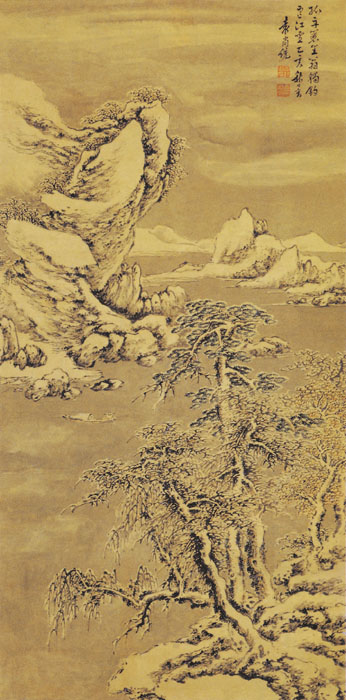 这幅画取唐人诗意——“孤舟蓑笠翁,独钓寒江雪”。画清冷静寂的湖面上,停一小舟,一位蓑笠翁正独自垂钓,对岸山势险峻,天空阴沉,将雪山反衬得更为鲜明。近处挺劲的青松被积雪覆盖,迎风傲立,枯树低枝,颇具生机。在艺术表现上,这幅画取平远布局,构图有宋人笔意。画面上的色调单纯,点以赭石、花青,与墨色相间。一派寒气,使作品凝重而又生气,充满了静寂、萧寒的气氛。