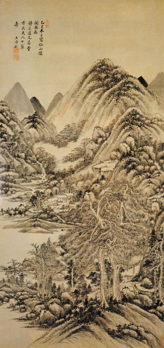 此画描绘的是长松高岭,溪水村舍。由画中题识可知此画是一幅贺寿之作。画中以两株粗壮茂盛的参天巨松压轴,寓意常青不老。画面的远景是连绵的山岭,水溪从山中流出,至低处汇成大河,在山水林木的环抱中隐约可见幽静的楼阁。此画在笔墨表现上宗法黄公望,峰峦层叠,树丛浓郁,勾线空灵,苔点细密,皴笔干湿浓淡相映衬,皴擦点染兼用。此画的用墨明洁苍润,得自于董其昌的影响。这幅画气厚力陈,显示了王时敏深厚的笔墨功力。