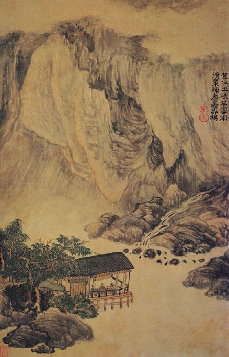 清 王时敏 纸本设色 纵39厘米 横25.7厘米 北京故宫博物院藏 此图共十二页,每幅隶书杜诗二句, 后幅页又自跋云:“少陵诗体宏众妙,意匠经营高出万层,其奥博沉雄,有掣鲸鱼探凤髓之力,故宜标准百代,冠古绝今,余每读七律,见其所写景物,瑰丽高寒,历历在眼,恍若身游其间,辄思寄兴盘礴。适旭咸甥以巨册属画,寒窗偶暇,遂拈景联佳句,点染成图,顾以肺肠枯涸,俗赖填塞,于作者意惬飞动之致,略未得其毫末。诗中字字有画,而画中笔笔无诗,漫借强题,钝置浣花翁不少,惭愧!惭愧!西庐老人王时敏”。此册页画巫峡弈棋,松云绝壁,山村春色,藤月荻花。用笔颇为潇逸,满纸墨韵,非常生动。 |