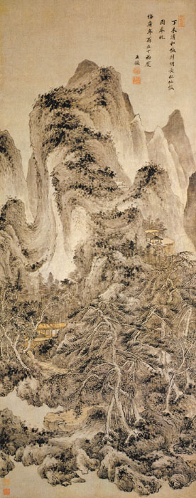 本幅自题:“丁未清和仿叔明《长松仙馆图》,奉祝悔庵年翁五十初度。王鉴。”上款“悔庵”为尤侗(公元1618—1704),字同人,号悔庵 ,“丁未”年恰值尤侗50岁,故此图是王鉴为尤侗贺寿之作。《长松仙馆图》为王蒙名作,王鉴作图全仿王蒙画法。景色高深,林木郁茂,用笔繁密,水墨淹润。尤其苍莽的笔法和丰富的墨色层次变化,深得王蒙神韵。