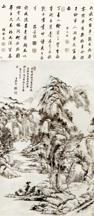 此图为仿黄公望富春山居图长卷意趣而作。图中描绘一高山大岭之间,林木茂盛,云气蒸腾。细瀑飞挂,崖边孤亭独立,山涧屋舍栉比。整个画面,水光山色,溶为一片,意境清和,宁静悠远。画中构景丰富,主次有序,揖让错落,和谐自然。其笔法松秀,多用披麻、米点、折带皴法,山石树木形体类黄公望富春山居,虚和宁静。其墨色以淡为主,浓淡相间,多用干笔,因而使画面亦具有苍茫而浑厚之感。
