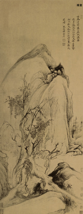 图中描绘高耸云际的峰崖,山脚下幽壑深曲,松柏丛茂,碎石间清流飞溅,水势湍急。溪流迥转处,平滩浅濑,芦荻清翠细润。此图为仿古之作,章法严谨,笔墨沉稳,山石画法受董源及吴镇山水的影响,皴法朴厚苍浑,树木、藤枝、芦苇则用笔尖细劲利,风格灵秀生动。本幅自识:“古木垂萝高岩溅瀑图。放笔藤花落研池,夜来移石有云知。开轩长挂南山影,何必东篱泛菊时。昆陵恽寿平。”