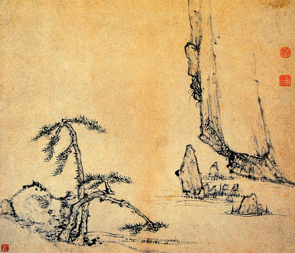 弘仁山水画笔墨精谨,格局简约,虽师法倪瓒,但又能“于极瘦削处见腴润,极细处见苍劲,虽淡无可淡,而饶有余韵”。此幅《临水双松图》中,弘仁极少用粗笔浓墨,也少点染皴擦,不让作品中出现丝毫的粗犷霸悍,张扬外露的习气,全以精细的松灵之笔徐徐写出,于空灵中显充实,静谧于寓深秀,结构出一派纯净、幽旷而又俊逸的意境,给人以品位无穷的审美感受。