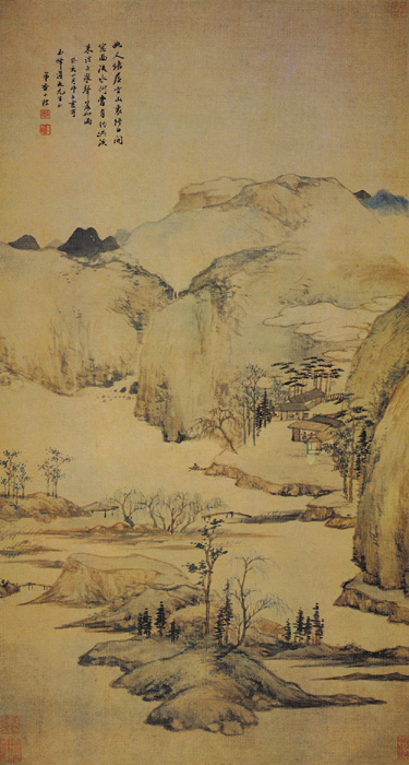 查士标在绘画上师法倪云林、董源和米芾。倪云林画是枯淡、静柔的,查画则以疏散简率之笔,潇洒纵横。下笔速度率意,干净利索。在清代张庚《国朝画征录》中记载:查士标,画初学倪高士,后参以梅华道人、董文敏笔法,用笔不多,惜墨如金,风神懒散,气韵荒寒,逸品也。这幅画上,画家用干笔皴擦,率意中不乏繁复;布局工整,树石刻画精微,淡设色极淡雅。此图画空旷山峰的起伏中,一屋舍悄立于中,意境清幽明净,风格诚如清代张庚所论。