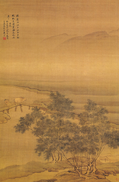 萧晨,生年不详,约卒于康熙中叶,字中素,号灵曦,扬州人,共诗,亦善画工笔山水、人物。自题于右上角云:“画寄苍翁先生大词宗,并题博正。”画面构图严谨,依次为河岸延伸之景,岸畔树木、书屋隐现其中,河中一座小小木桥,古朴简洁,远处河岸蜿蜒,连接着一座小山,山上有溪流注入河中,一派安详,静谧的气氛。作者构思巧妙,精细的布局用笔设色又体现出一贯的风格与功底,二者结合在一起方能产生如此完美的应和之作。