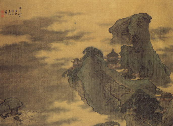 袁江,生年不详,约卒于乾隆初,字文涛,邗江(江苏扬州)人,善画界面楼台,曾供奉“内廷”。此画描绘神话传说中的蓬莱三山,画面构图奇峻,风格奇丽。在一片浩淼无垠的波涛中,矗立着几处奇峰,山色苍翠,挺拔峻峭,显得格外雄险而气势磅礴。山上亭台楼阁林立,松柏、梅林环绕,烘托出一片世外仙境的风景,显得既有人情味,又确实虚无缥缈,惟仙风道骨的世外之人方可生存于此。
