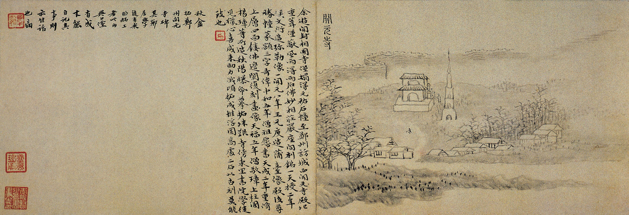 黄易(1744—1802)字大易,号小松,浙江杭州人。他精于篆刻,与丁敬齐名,并称“丁黄”,为西冷八家之一。黄易是位著名的金石学家,潜心于金石碑版,他曾系统地整理秦汉碑石,并四处寻访,足迹半天下。《嵩洛访碑图》就是黄易用画笔记录他搜寻碑刻的场面和所到的地方,画家以淡墨干笔,寥寥数笔,唯突出碑石直立,三人皆立碑前,指指点点,似在很认真的看着碑文。此图简淡融有金石味,具有冷逸之致,萧寥纯朴,疏淡之中又觉古气盎然。
