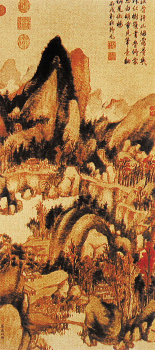 董邦达(1699—1769),字孚存,号东山,浙江富阳人,官礼部尚书。画山水、笔墨古拙,神韵悠然,笔锋谨严,但有乏奇趣之缺。其风格在娄东、虔山派之间。所画屋舍工整严谨,笔法有些拘束,少了一些洒脱闲逸之气,丘壑虚实亦嫌松懈,但其笔墨神逸尚有一些气韵,迥异于在野文人的清风傲骨,笔法拘束细碎,也乏开阔自由之胸意,给人沉闷拘缩之感,正所谓作画如同做人,“画如其人”是极有道理的。