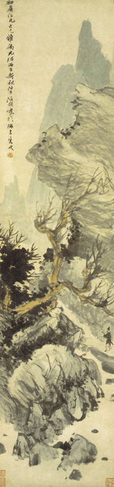 据说任颐的绘画“虽极细之笔,必悬腕中锋。”其自称“作画如颐,差足当一写字”,并以书法用于画中,参用于画意,给人以惊奇不凡之感。任颐为“海上画派”的代表人物。《秋山策杖图》的背景只以几笔渲染点破,简约明晰,是比较放松的,人物的神态,自由自在,正沿着山坡而行,山石高耸,皴法遒劲,奇峰怪石,淡墨出之。远山则以淡墨水平涂之,前景浓墨点。画面峰峦清深,意趣高古。