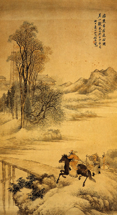 任预(1854—1901),字立凡,浙江萧山人,任熊之子,在上海、苏州一带卖画,画艺得任熊、任薰的指点,善长画人物,山水和花鸟。构图别致,设色淡雅,花卉学宋人勾勒法。山石用斧劈皴,着色清丽,别有韵致,淡雅而不失神采,构图满实,有实有虚。此画题跋“指点前程远,相期着一鞭”,是任预30岁时所作,有可能是以“霸桥送别”为内容,表现的是送别的场面。