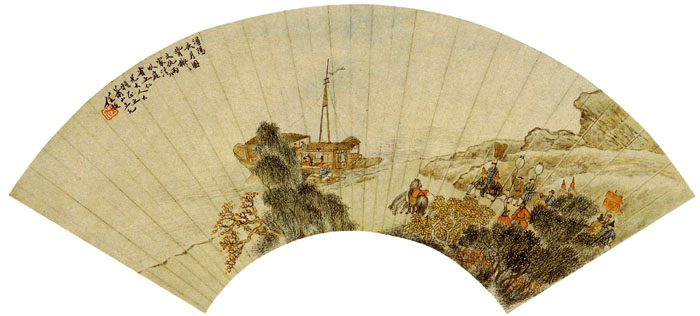 此画是根据白居易的《琵琶行》创作的,画家摄取浔阳江头夜送客场景。前景为一耸杂树,后为码头,码头右侧的山坡峦石,江边上停着两艘船。画面表现的是:“元和十年予左千九江郡司马,明年秋,送客湓浦江口”的情景。画家将树叶画成黄色及红色,使人感到秋夜送客萧瑟落寞之感,烘托出秋意已浓。画家的题款:浔阳夏月图,拟文仇两家法。