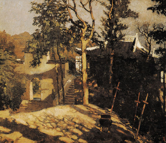徐悲鸿(1895—1953),江苏宜兴人, 自小受父亲影响, 喜好临摹清末画家吴友如的人物画及烟盒上的动物画片。稍长得识康有为, 折服其推崇宋画“合中西而为绘画新纪元”之见解。1917年赴日, 他如饥似渴了解和学习西方绘画, 1919年赴法国留学, 专攻美术, 先入巴黎美术学校弗拉孟画室。徐悲鸿练就了扎实的西画功底,对传统中国绘画也十分着迷。这幅风景油画描写通往鸡鸣寺道中的景物,阳光明媚,道路曲折多起伏,很有生活情调。 |