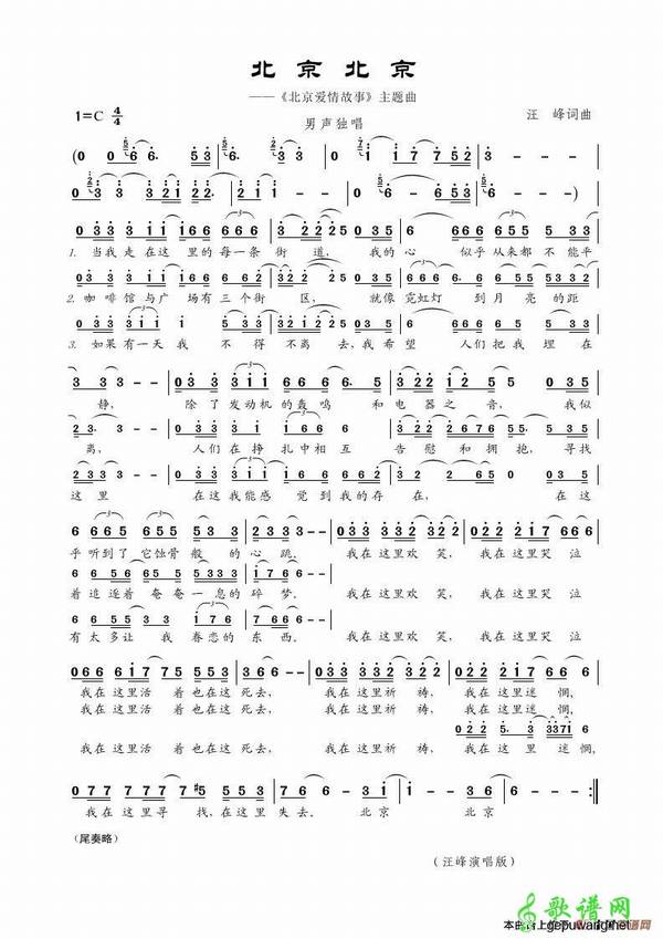 歌曲名:北京北京 演唱:汪峰 作词:汪峰 作曲:汪峰 基调:C调