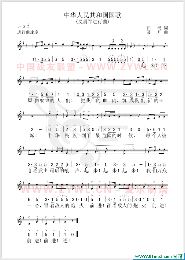中华人民共和国国歌 线、简谱混排版