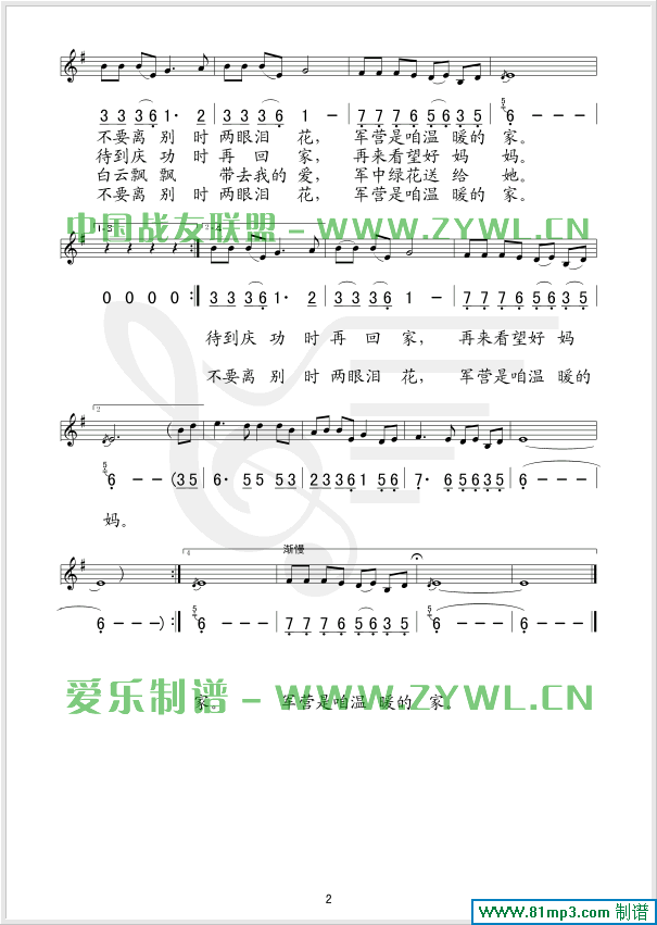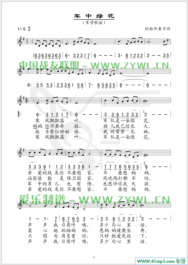 军中绿花 线、简谱混排版