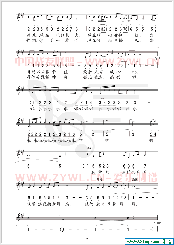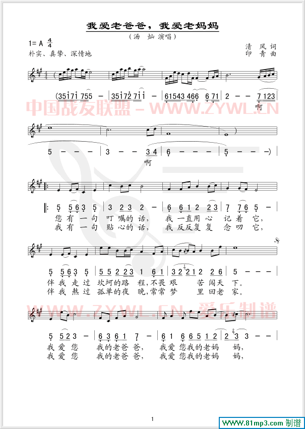 我爱老爸爸,我爱老妈妈 线、简谱混排版