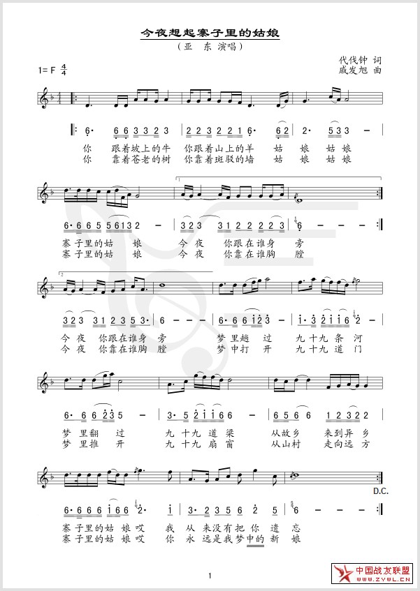今夜想起寨子里的姑娘 线、简谱混排版