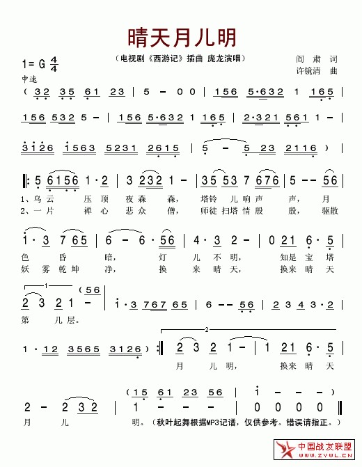 睛天月儿明(电视剧 西游记 插曲)简谱