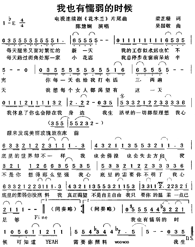 我也有懦弱的时候(《花木兰》片尾曲)[简谱]