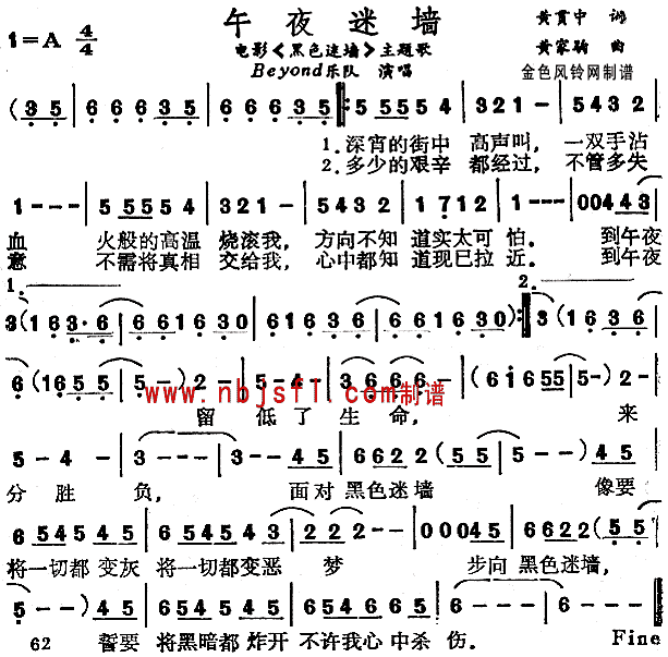 午夜迷墙(《黑色迷墙》主题歌、粤语)[简谱]