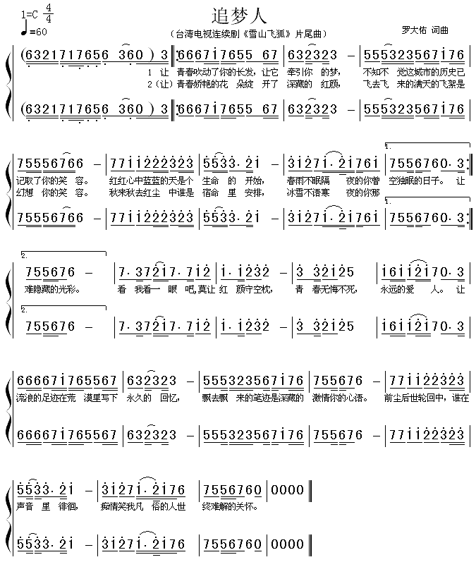 追梦人(《雪山飞狐》片尾曲、二声部)[简谱]