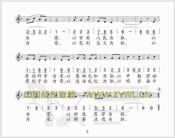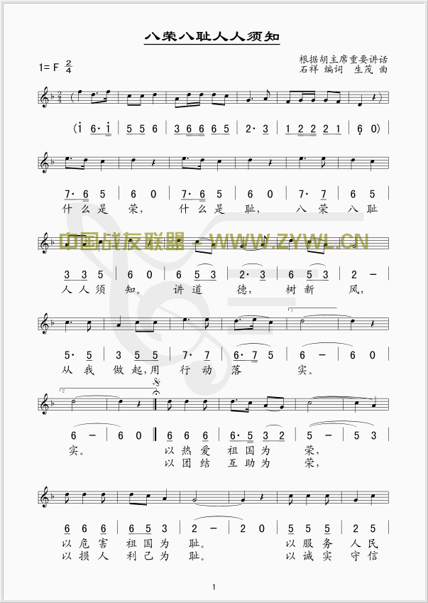 八荣八耻人人须知(五线谱/简谱对照、版本一)