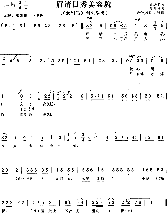 眉清目秀美容貌《女附马》[戏曲曲谱]
