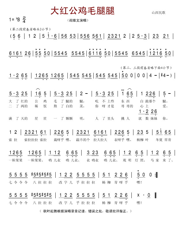 大红公鸡毛腿腿(山西民歌)