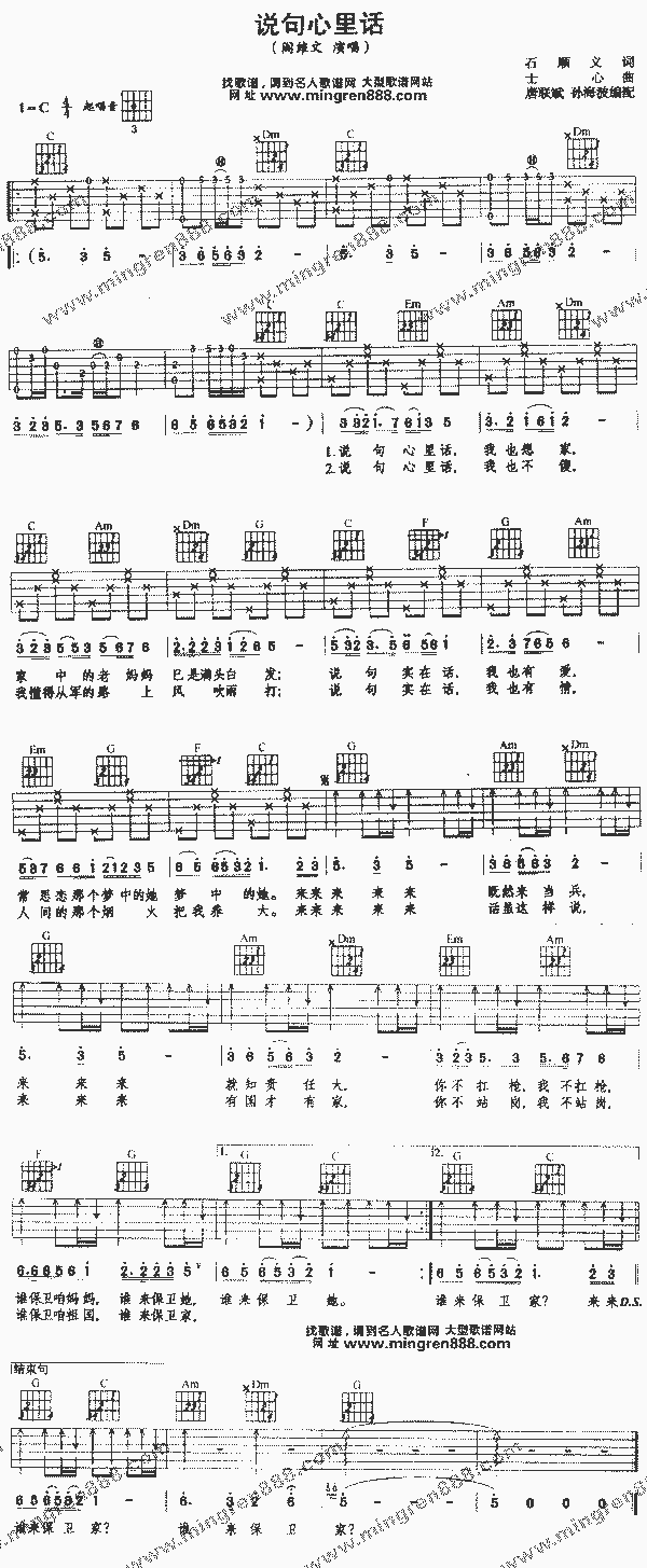 说句心里话我也不傻我懂得从军的路上风吹雨打说句实在话我也有情人间的烟火把我养大来来来话虽这样说来来来有国才有家你不站岗我不站岗谁保卫咱祖国谁来保卫家谁来保卫家