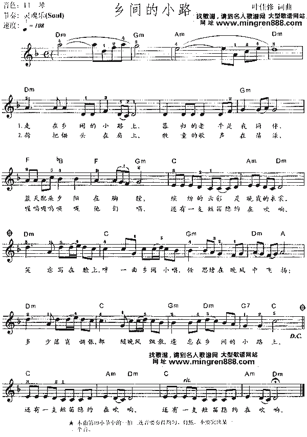 走在乡间的小路上 暮归的老牛是我同伴 蓝天配朵夕阳在胸膛 缤纷的云彩是晚霞的衣裳 荷把锄头在肩上 牧童的歌声在荡漾 喔喔喔喔他们唱 还有一支短笛隐约在吹响 笑意写在脸上 哼一曲乡居小唱 任思绪在晚风中飞扬 多少落寞惆怅 都随晚风飘散 遗忘在乡间的小路上 走在乡间的小路上 暮归的老牛是我同伴 蓝天配朵夕阳在胸膛 缤纷的云彩是晚霞的衣裳 笑意写在脸上 哼一曲乡居小唱 任思绪在晚风中飞扬 多少落寞惆怅 都随晚风飘散 遗忘在乡间的小路上 走在乡间的小路上 牧童的歌声在荡漾 喔喔喔喔他们唱 还有一支短笛隐约在吹响 还有一支短笛隐约在吹响 还有一支短笛隐约在吹响 |