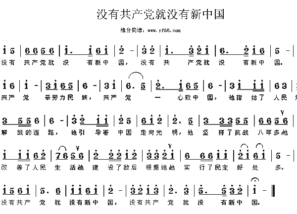 没有共产党就没有新中国 没有共产党就没有新中国, 没有共产党就没有新中国, 共产党辛劳为民族, 共产党他一心救中国, 他指给了人民解放的道路, 他领导中国走向光明, 他坚持了抗战八年多, 他改善了人民的生活, 他建设了敌后根据地, 他实行了民主好处多. 没有共产党就没有新中国, 没有共产党就没有新中国. 没有共产党就没有新中国, 没有共产党就没有新中国, 共产党辛劳为民族, 共产党他一心救中国, 他指给了人民解放的道路, 他领导中国走向光明, 他坚持了抗战八年多, 他改善了人民的生活, 他建设了敌后根据地, 他实行了民主好处多. 没有共产党就没有新中国, 没有共产党就没有新中国. |