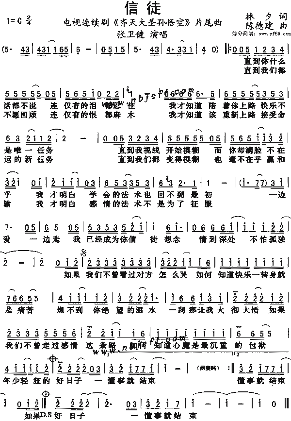 | 信徒 《齐天大圣孙悟空》片尾 歌手:张卫健 知道你什么话都不说 连仅有的泪都忍住 我才知道陪着你上路 快乐不是唯一任务 直到我视线开始模糊 而你却满脸不在乎 我才明白学会变法术 也回不到最初 一边爱一边走 我已经成为你信徒 相信情到深处不怕孤独 如果我们不曾看过对方这么苦 如何知道快乐一转身就是痛苦 想不到你绝望的泪水 一刹那让我大彻大悟 如果我们不曾走过感情这条路 如何知道心魔是最沉重的包袱 年少轻狂的好日子 一懂事就结束 知道我们都不愿回顾 连仅有的恨都麻木 我才知道该重新上路 接受命运的新任务 直到我们都变的模糊 也毫不在乎赢和输 我才明白 感情的法术不是为了征服 |