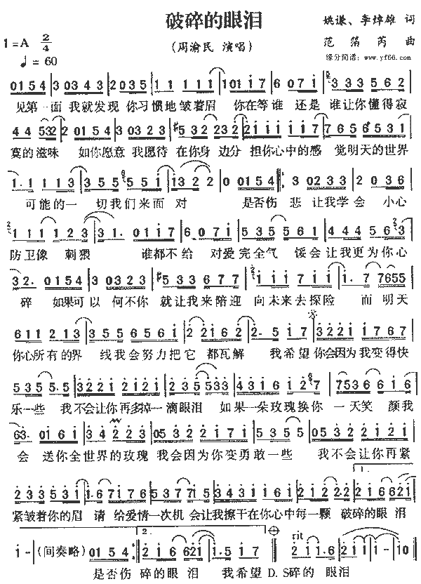 词:姚谦/李焯雄曲:范箔芮 见第一面 我就发现 你习惯的皱着眉 你在等谁 还是谁让你懂得寂寞的滋味 如你愿意我愿待在你身边 分担你心中的感觉 明天的世界 可能的一切 我们来面对 是否伤悲 让你学会 小心防卫像刺蝟 谁都不给 对爱完全气馁 会让我更为你心碎 如果可以何不你就让我来陪 迎向未来去探险 而明天 你心所有的界线 我会努力把它都瓦解 我希望 你会因为我变得快乐一些 我不会让你再多掉一滴眼泪 如果一朵玫瑰换你一天笑颜 我会送你全世界的玫瑰 我会因为你变勇敢一些 我不会让你再紧紧皱着你的眉 请给爱情一次机会 让我擦干在你心中每一颗 破碎的眼泪 |