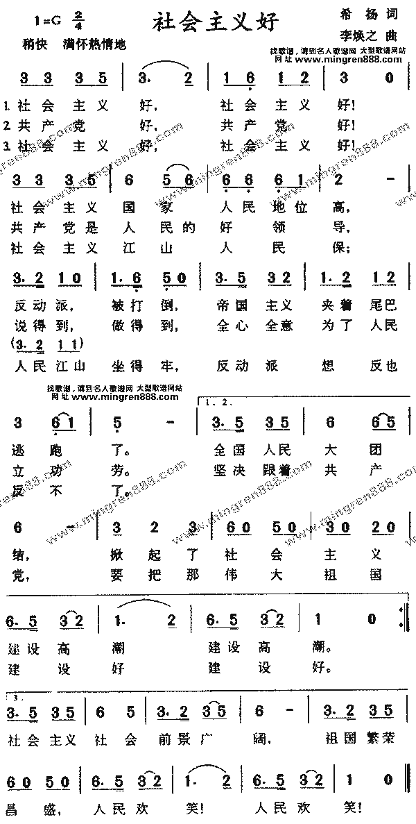 社会主义好, 社会主义好! 社会主义国家人民地位高, 反动派被打倒, 帝国主义夹着尾巴逃跑了. 全国人民大团结, 掀起了社会主义建设高潮, 建设高潮. 共产党好, 共产党好! 共产党是人民的好领导, 说得到, 做得到, 全心全意为了人民立功劳. 坚决跟着共产党, 要把伟大祖国建设好, 建设好. 社会主义好, 社会主义好! 社会主义国家人民地位高, 社会主义好, 社会主义好! 社会主义国家人民地位高, 社会主义好, 社会主义好! 社会主义江山人民保. 人民江山坐得牢, 反动分子想反也反不了. 社会主义已经胜利, 共产主义社会已经来到. 已经来到! 共产党好, 共产党好! 共产党领导中国富强了; 人民江山坐得牢, 反动分子想反也反不了. 社会主义一定胜利, 共产主义社会一定来到, 一定来到! 社会主义好! 社会主义好! 社会主义国家人民地位高! 社会主义好! 社会主义好! 社会主义国家人民地位高! 社会主义好! 社会主义好! 社会主义国家人民地位高! 社会主义好! 社会主义好! |