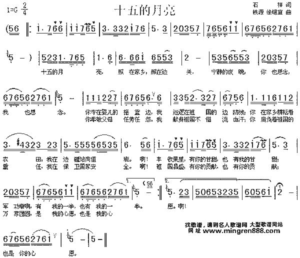 十五的月亮,照在家乡,照在边关. 宁静的夜晚,你也思念,我也思念. 你守在婴儿的摇篮边, 我巡逻在祖国的边防线; 你在家乡耕耘着农田, 我在边疆站岗值班. 啊a收果里有你的甘甜,也有我的甘甜; 军功章呵,有我的一半,也有你的一半. 十五的月亮,照在家乡,照在边关. 宁静的夜晚,你也思念,我也思念. 我守在婴儿的摇篮边, 你巡逻在祖国的边防线; 我在家乡耕耘着农田, 你在边疆站岗值班. 啊a收果里有你的甘甜,也有我的甘甜; 军功章呵,有我的一半,也有你的一半. 十五的月亮,照在家乡,照在边关. 宁静的夜晚,你也思念,我也思念. 我孝敬父母任劳任怨; 我肩负着全家的重任, 啊!祖国昌盛有你的贡献,也有我的贡献; 万家团圆,是你的心愿,也是我的心愿. 啊!啊-… 也是你的心愿 |